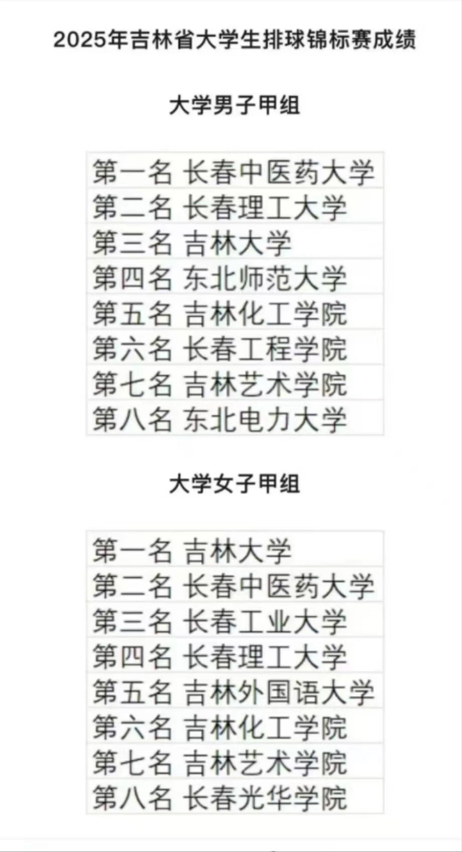 2025年5月28日,由吉林省学生体育协会主办,长春师范大学承办的吉林省大学生排球锦标赛圆满落下帷幕。我校排球代表队取得了男子甲组第五名和女子甲组第六名的优异成绩。队员们在比赛中敢打敢拼,不仅展现了我校排球队奋勇拼搏的精神风貌,更诠释了“严谨 勤奋 求实 创新”的校训精神。